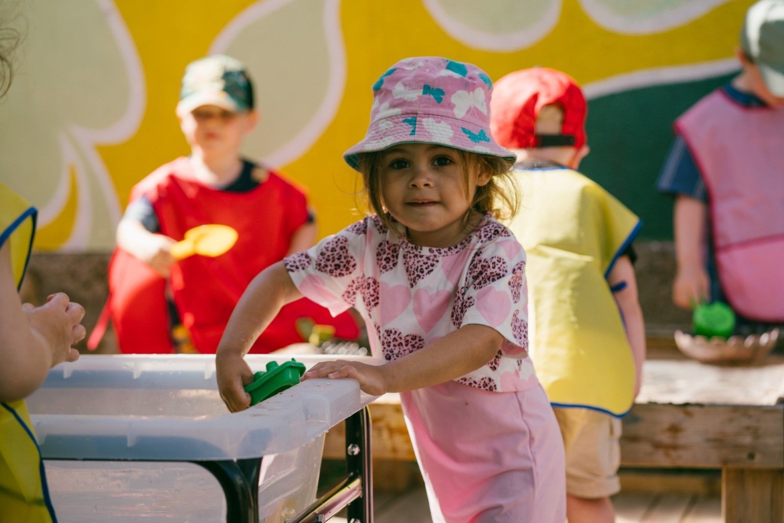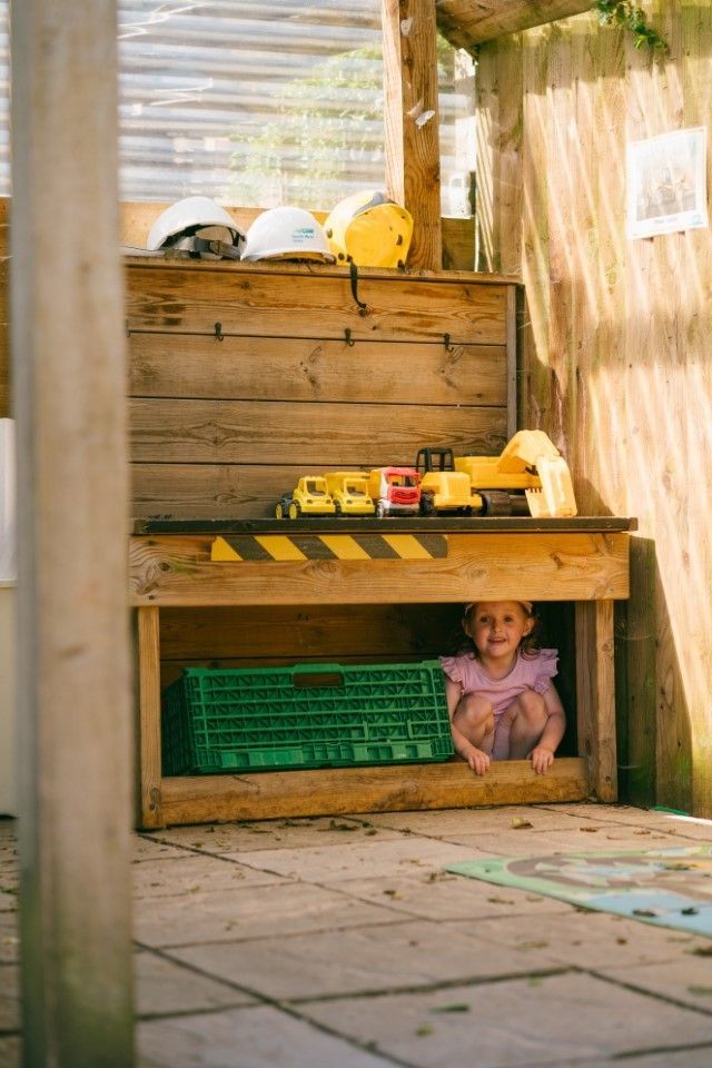Our garden has different areas for the children to explore, including a wooden train, mud kitchen, climbing frame bridge and sand pit.